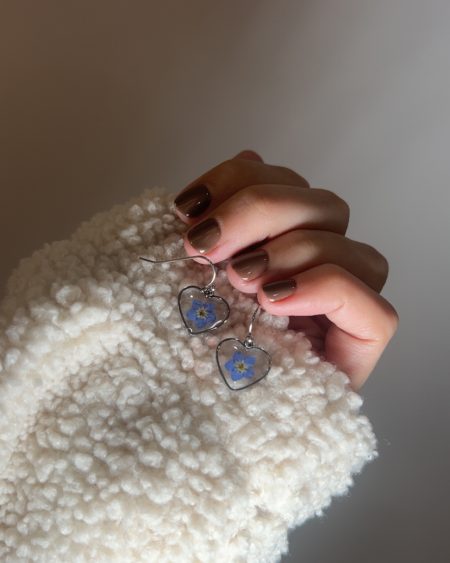 Tiny heart earrings made with real dried forget-me-not  flowers.