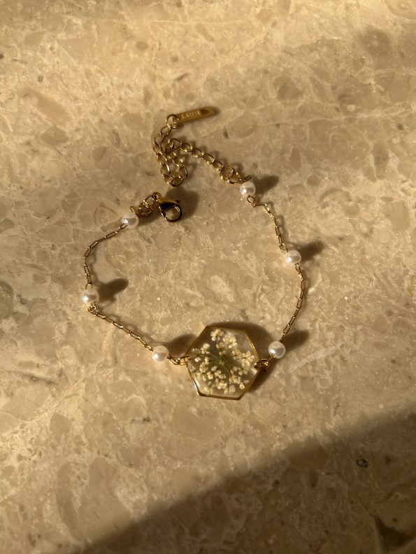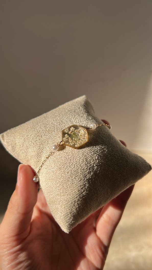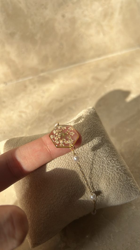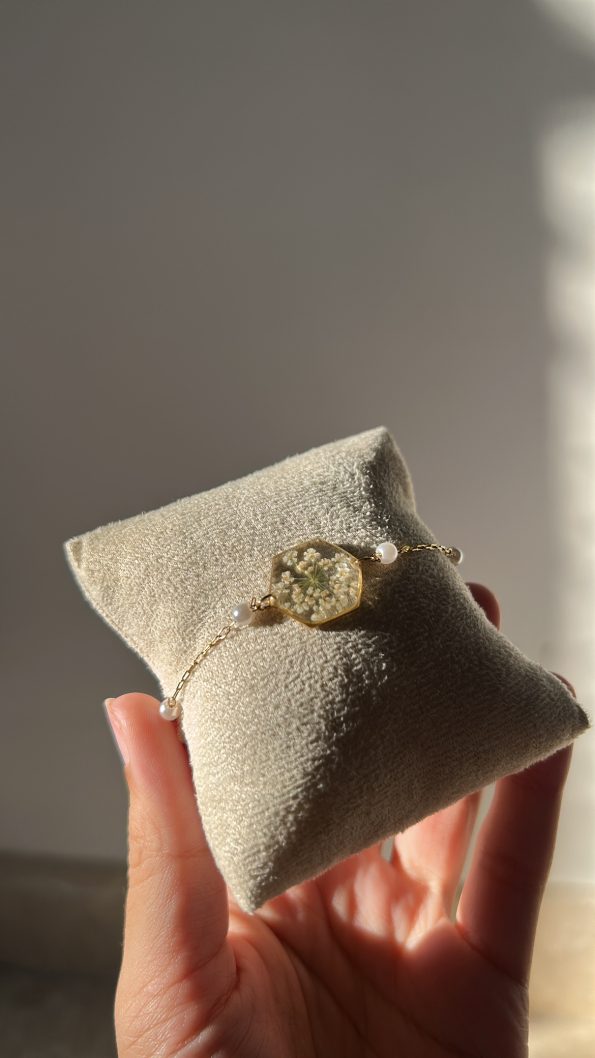 We named this bracelet Aurelia because of its soft golden glow and the little flowers that seem to last forever inside it. The pearls remind us of the moon that’s calm and gentle, resting beside the bloom. It’s a small piece of nature you can carry with you 💗