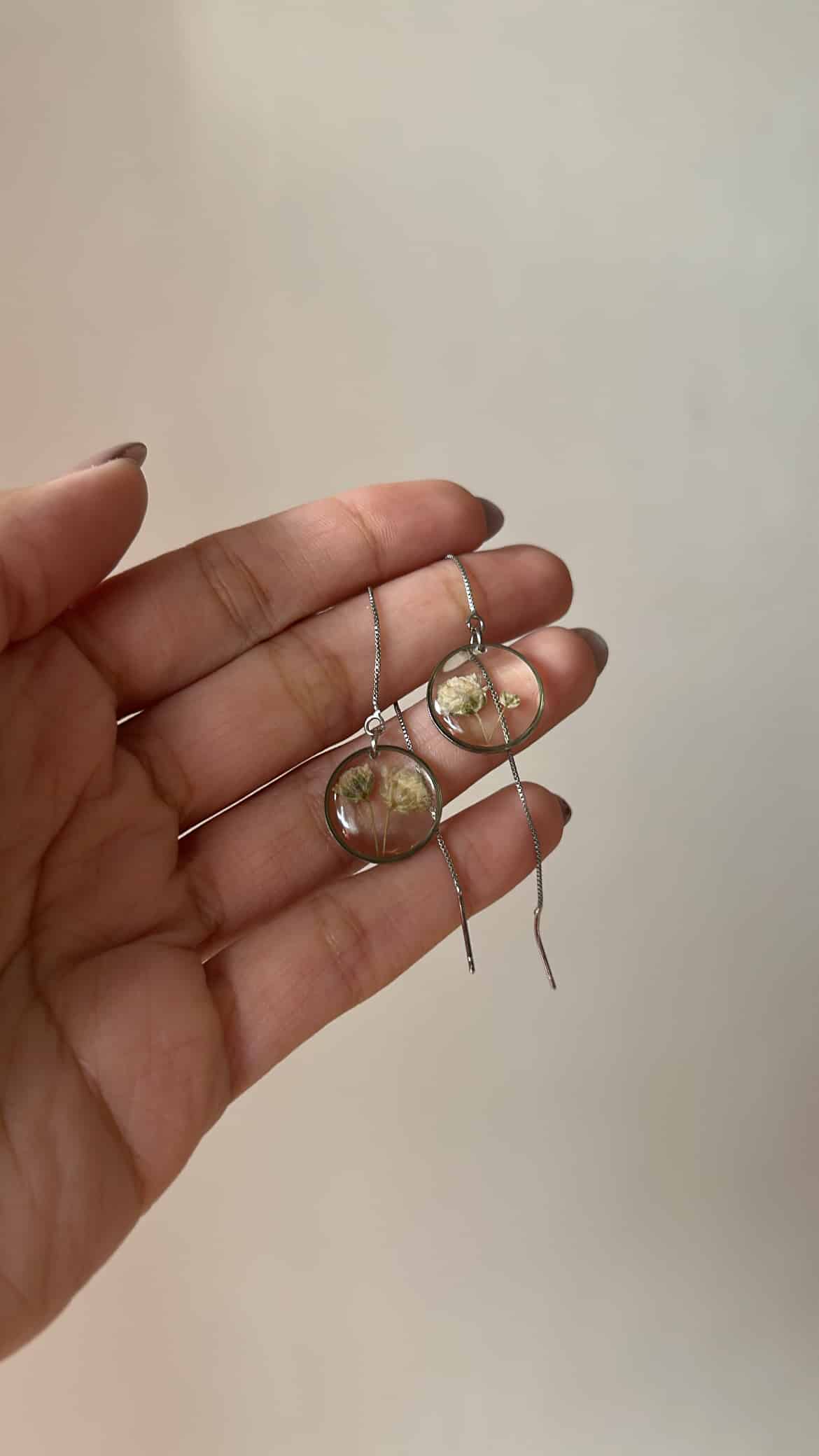 Design: Real baby’s-breath flowers encased in a clear resin circle, paired with sleek threader-style earrings