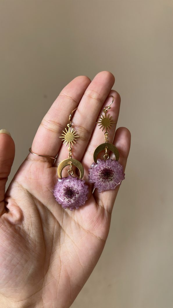 Handcrafted with real chrysanthemums and celestial charms. Anti-tarnish, hypoallergenic, and beautifully lightweight.