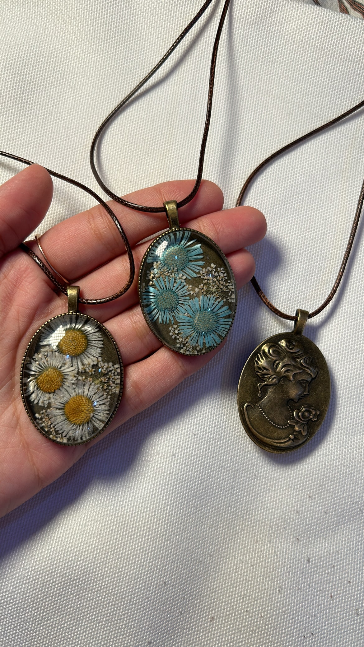 Design: A soft vintage-core pendant featuring your asters paired with delicate white Queen Anne’s Lace. It has a vintage design at the back, can be worn in two ways.Â