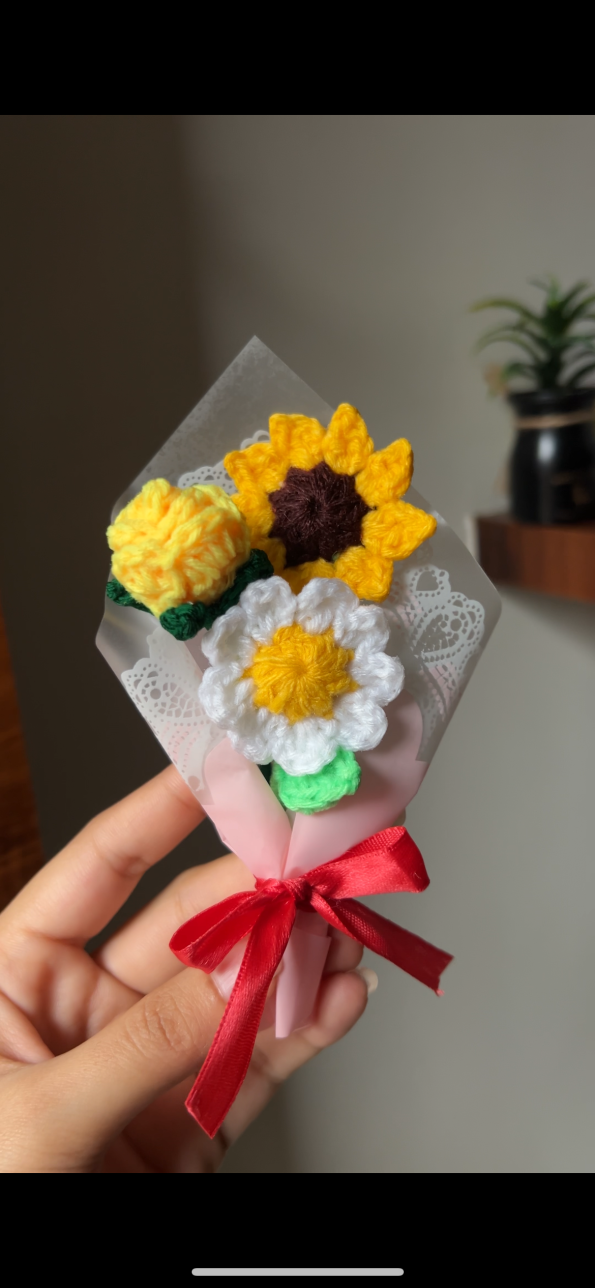 Crochet flower mini basket, a perfect touch for your car or home! It’s filled with forever blooms like daisies,rose, sunflowers, plum blossoms, eucalyptus, and lavender. 🪻🌺💐🌻🌼🌿