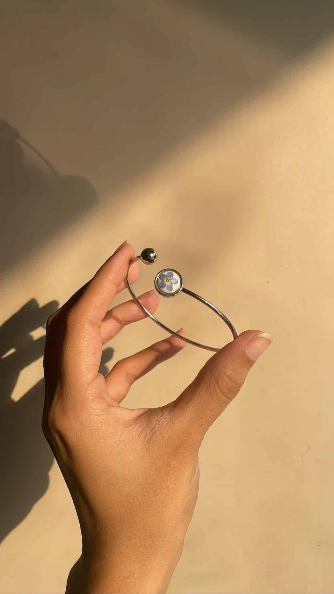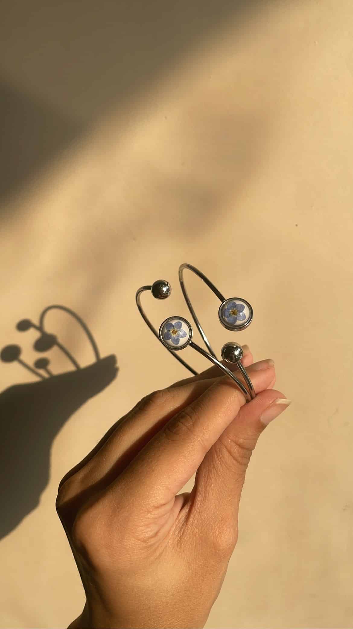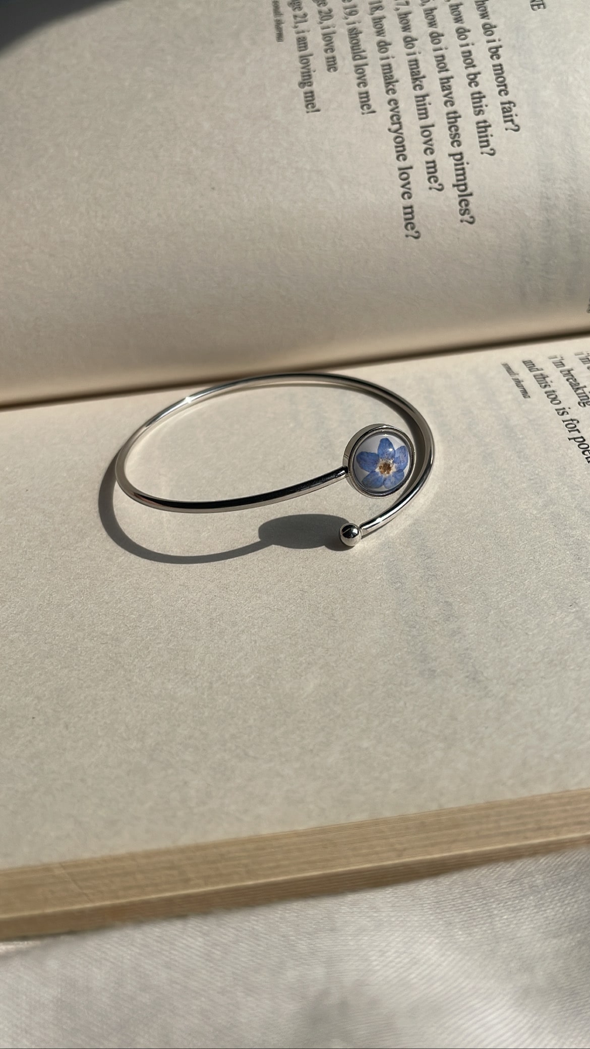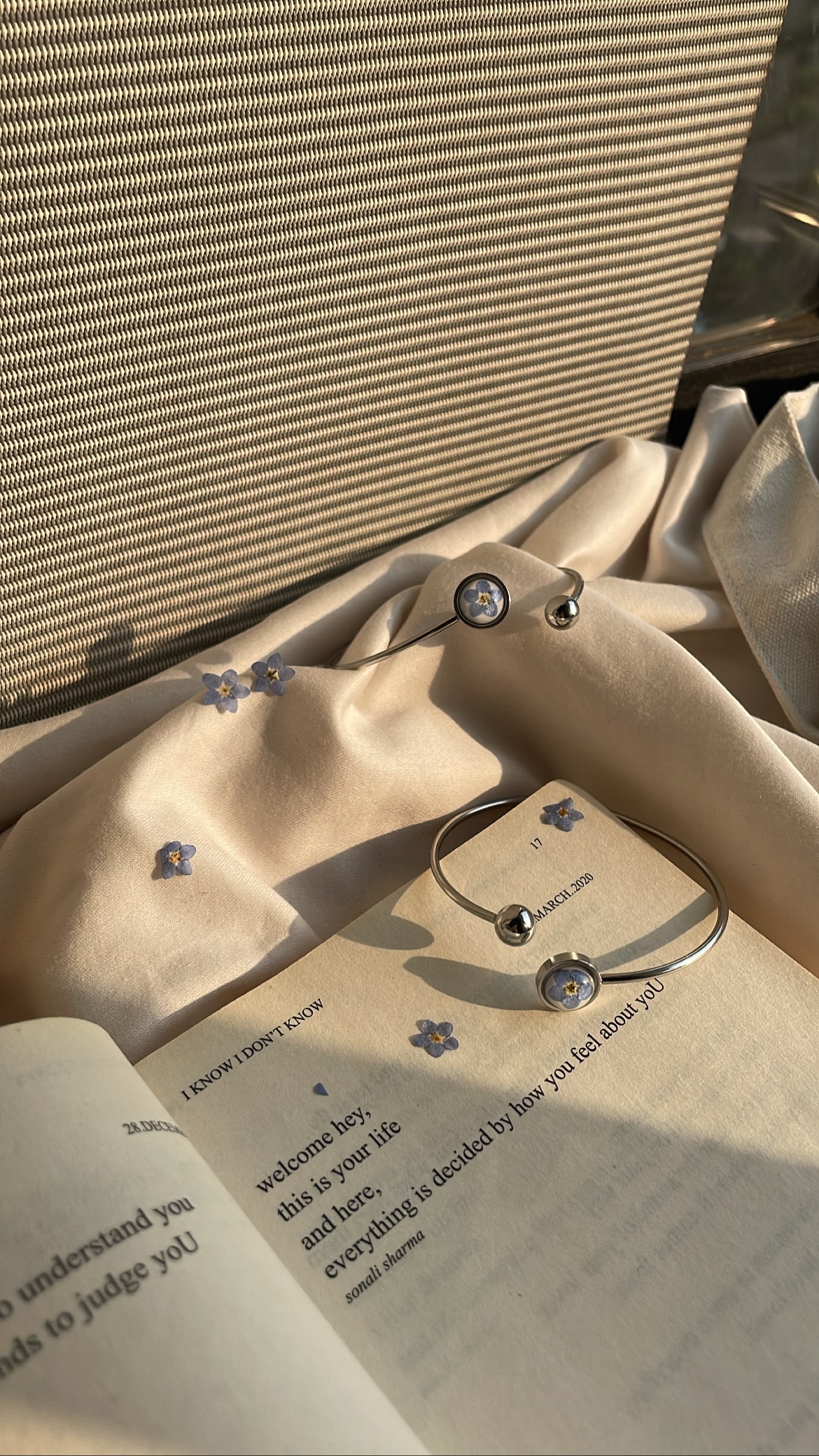 Design: Sleek adjustable bangles featuring delicate preserved blue blooms—simple, meaningful, and perfect for everyday stacking
