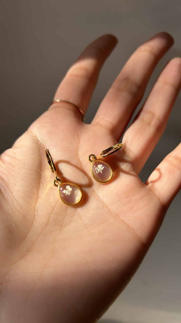 Design: Drop-shaped resin charms (approx. 1 cm each) paired with dainty huggie-style hooks
