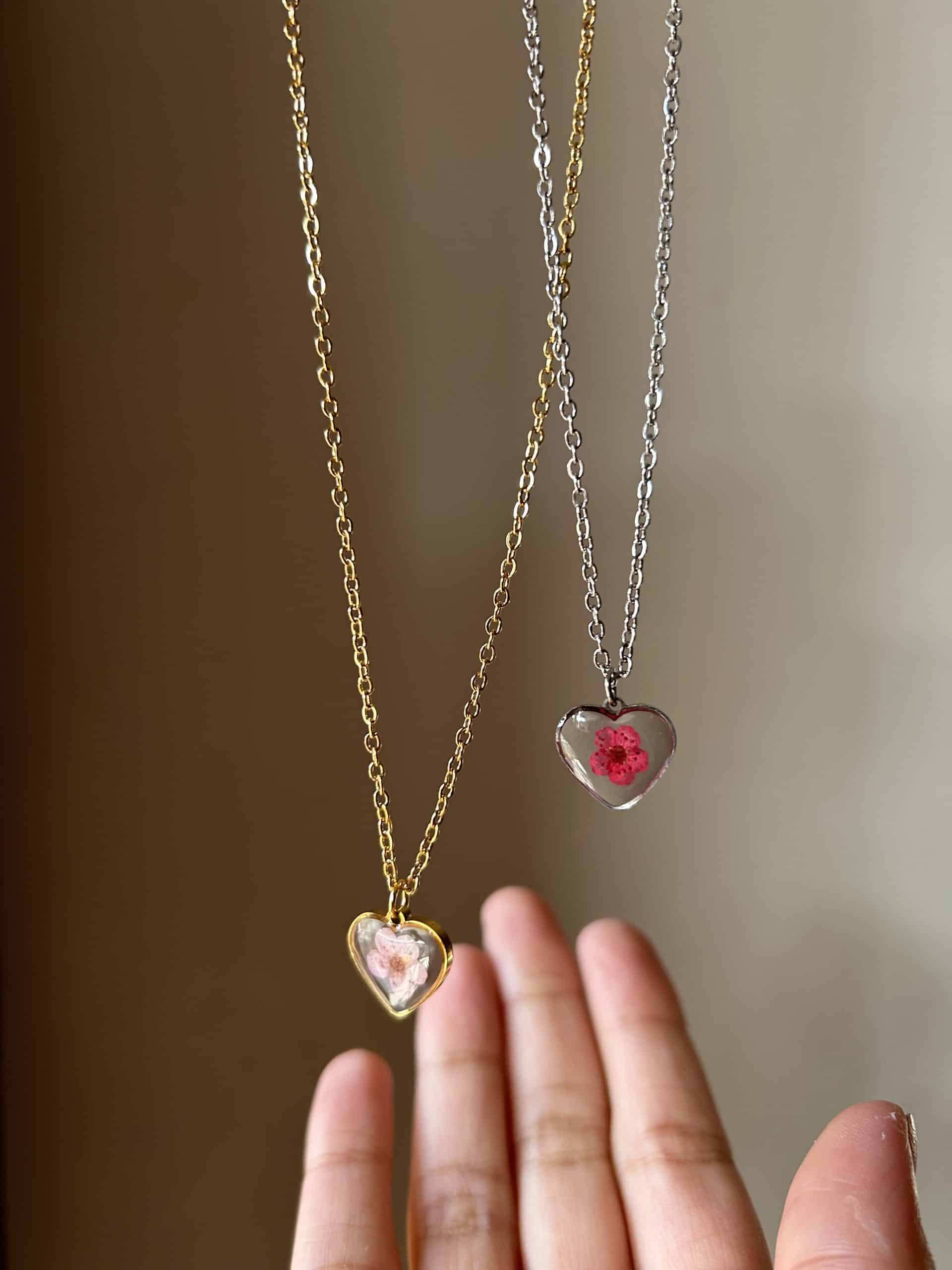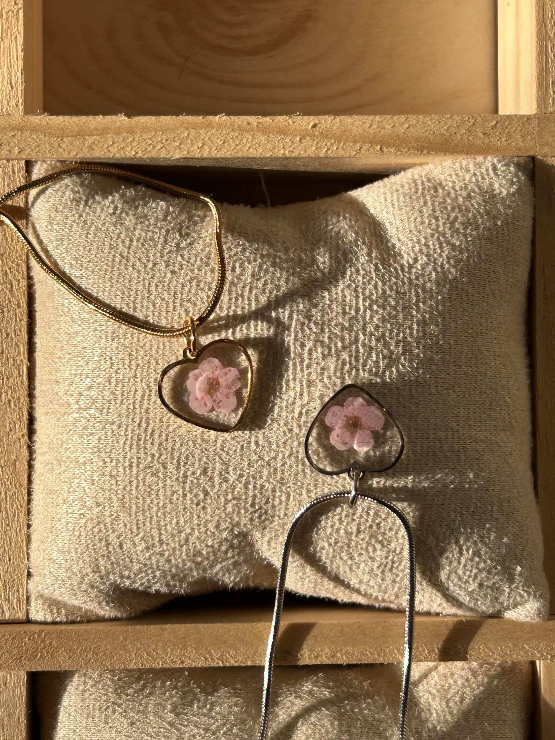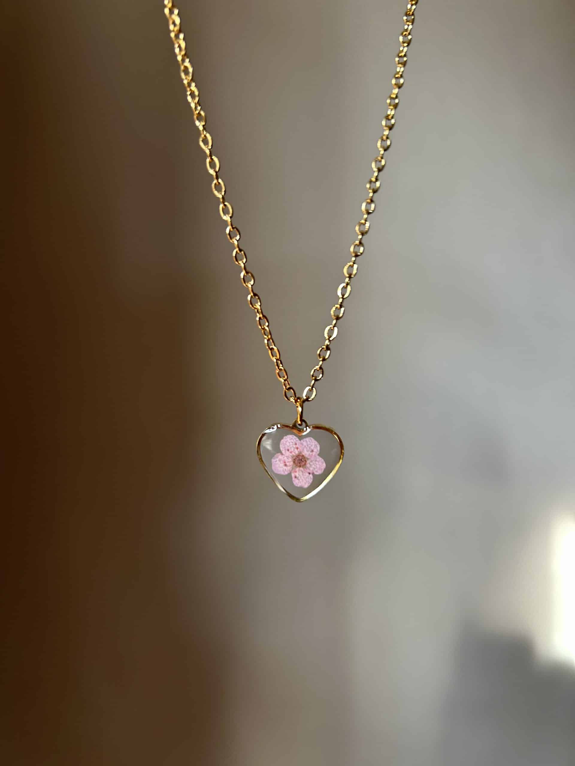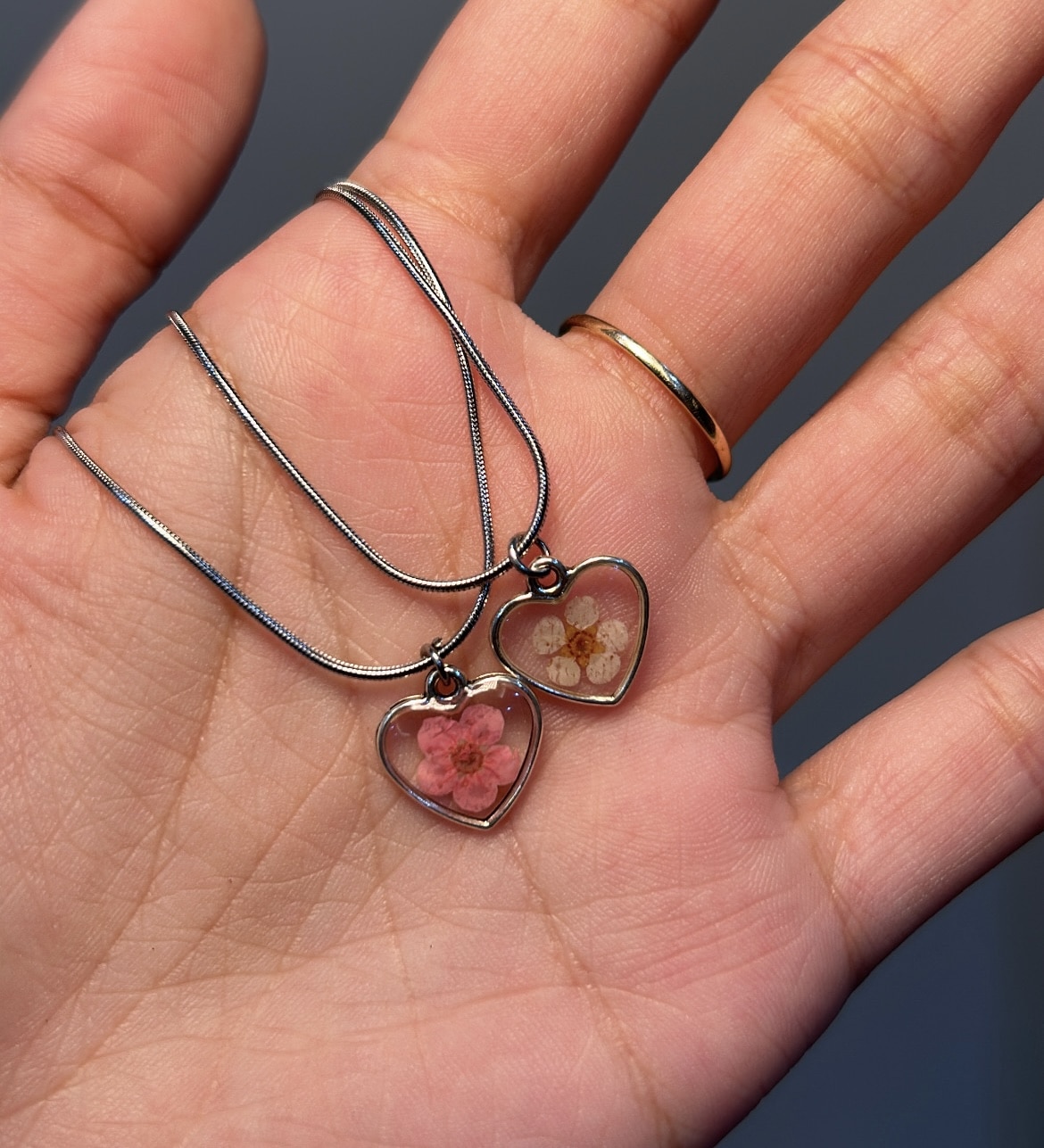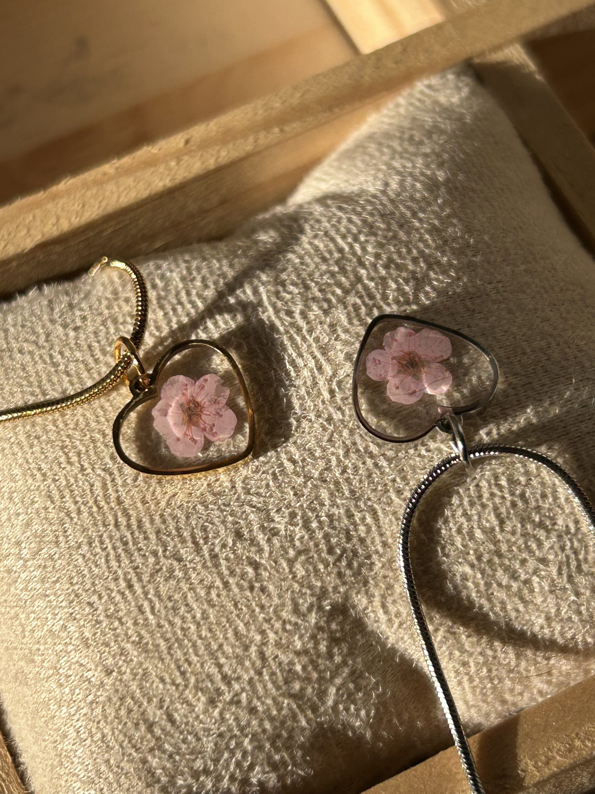Design: A delicate heart-shaped charm featuring your choice of real plum-blossom flower