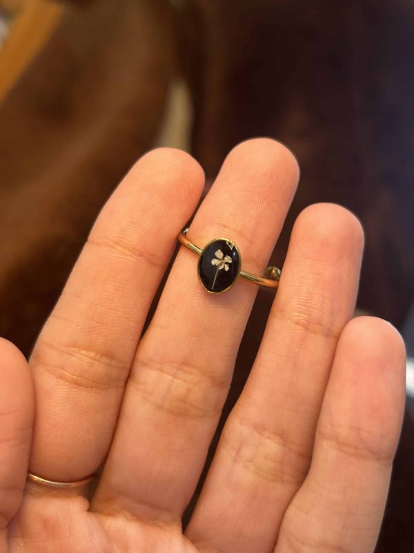 There’s something extra special about wearing a real flower. This tiny white bloom resting on a deep black base feels like a soft, graceful moment you get to carry every day.