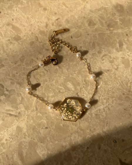 We named this bracelet Aurelia because of its soft golden glow and the little flowers that seem to last forever inside it. The pearls remind us of the moon that’s calm and gentle, resting beside the bloom. It’s a small piece of nature you can carry with you 💗