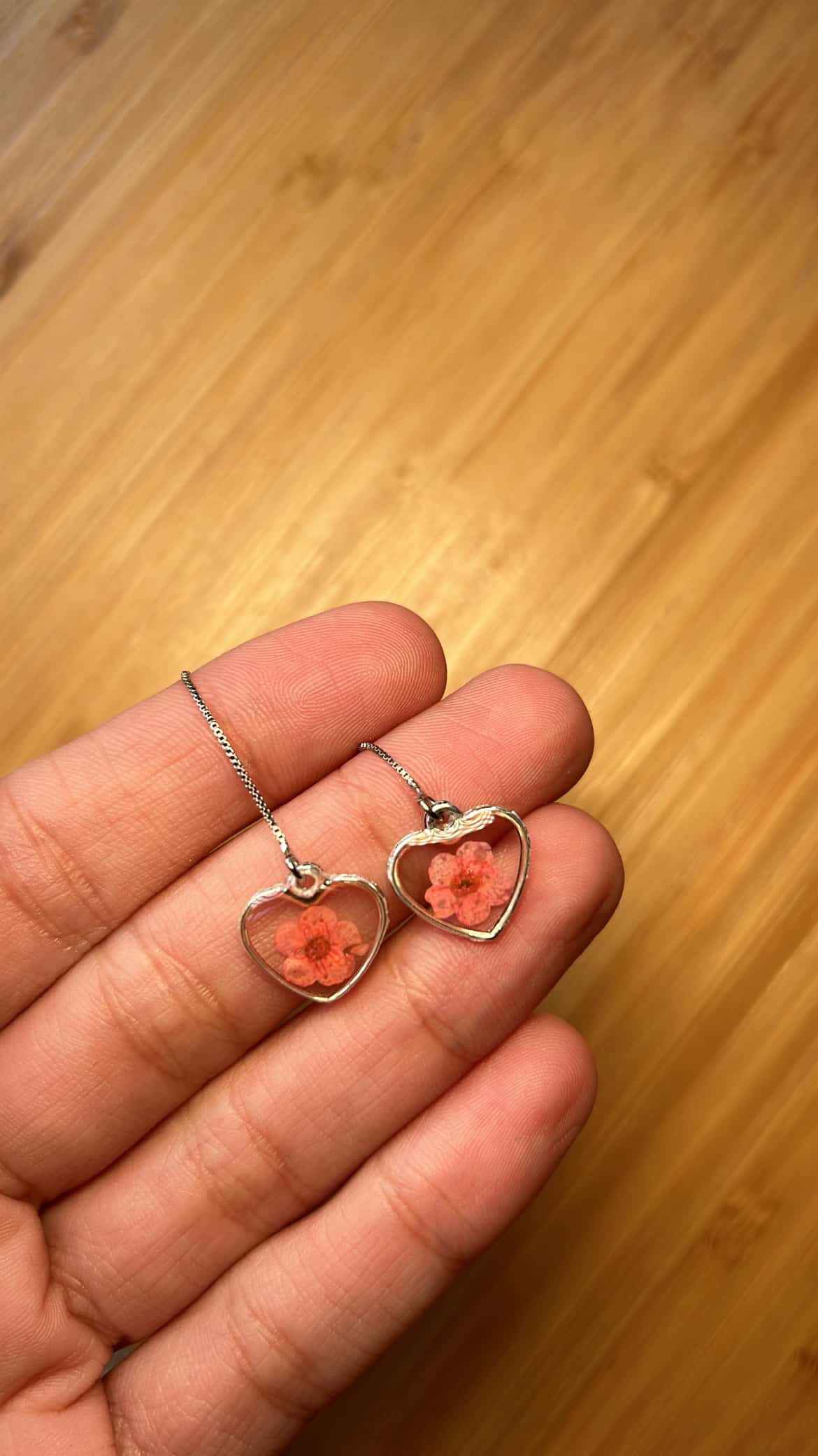 Iris Heart Earrings: Heart earrings featuring a tiny plum blossom inside, with threaders