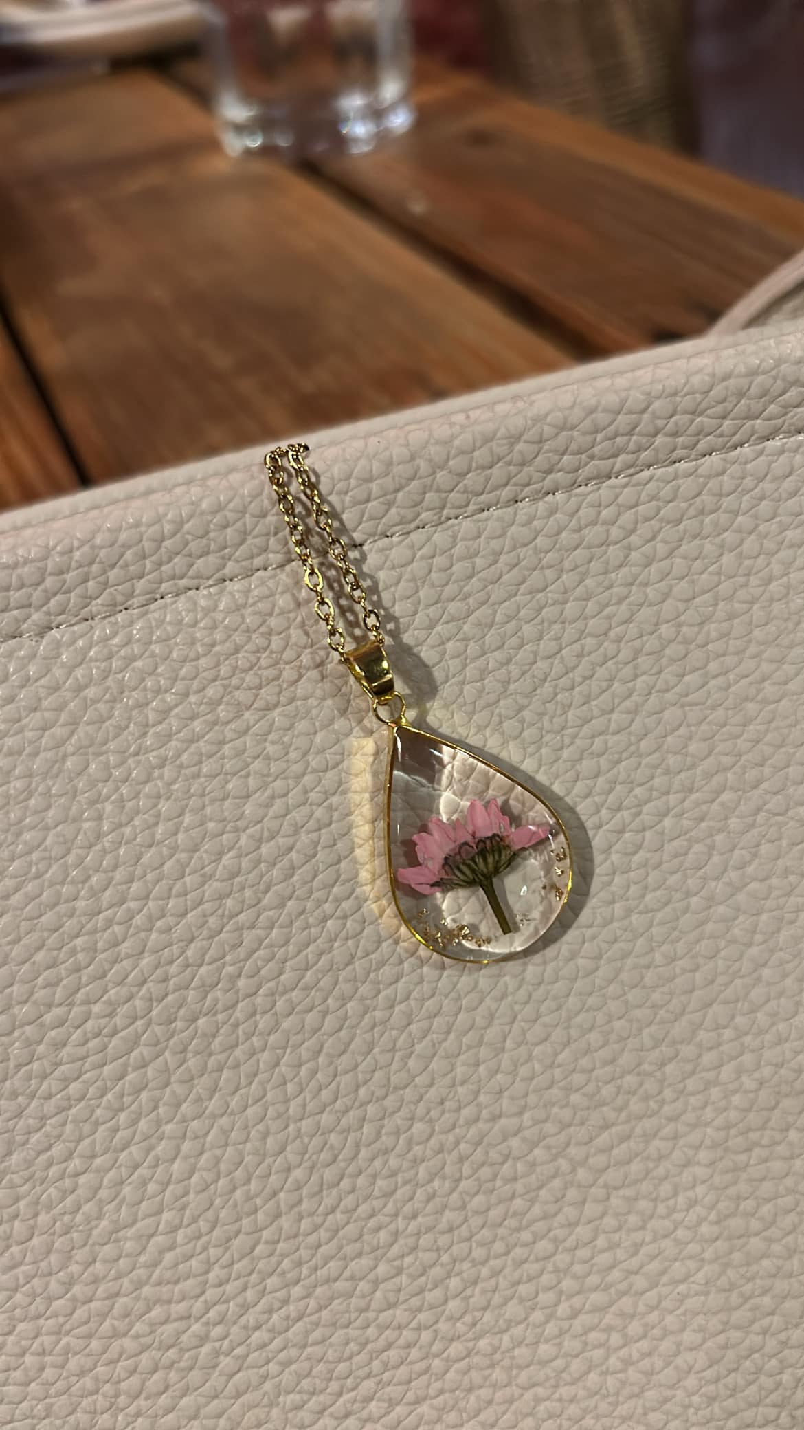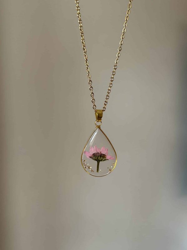Design: Drop-shaped resin charm filled with blush-pink, half-daisy florals for a soft, whimsical look
