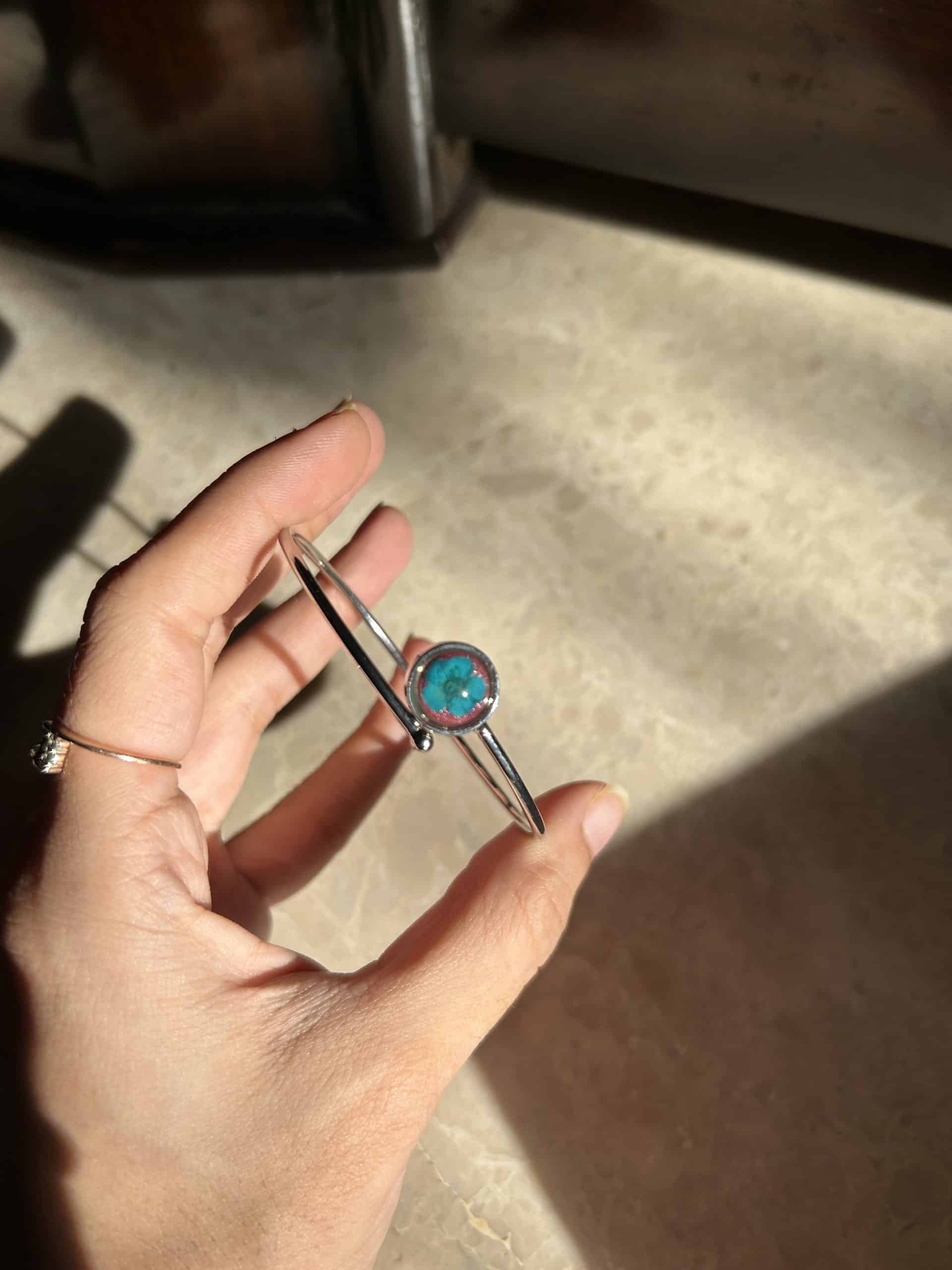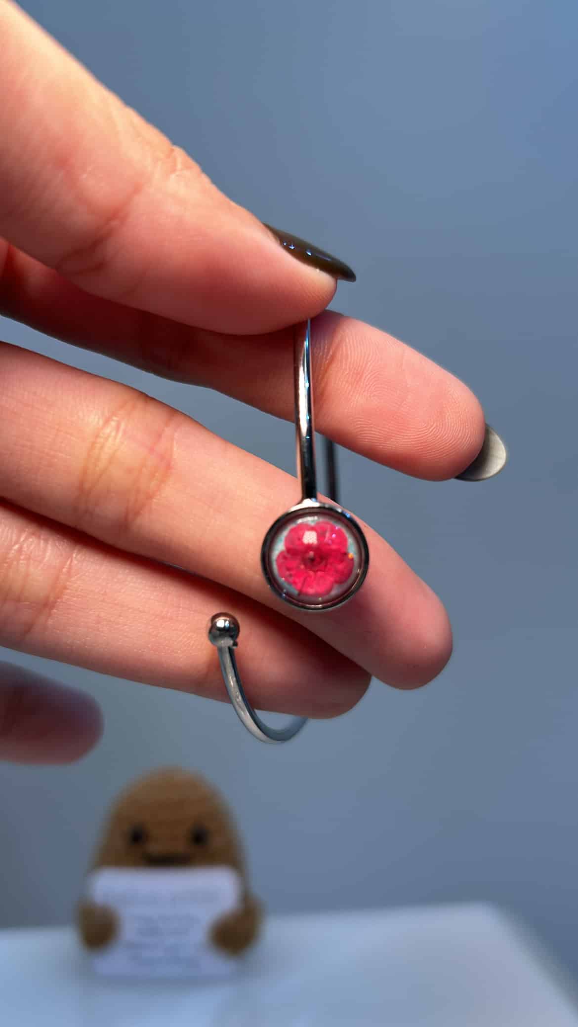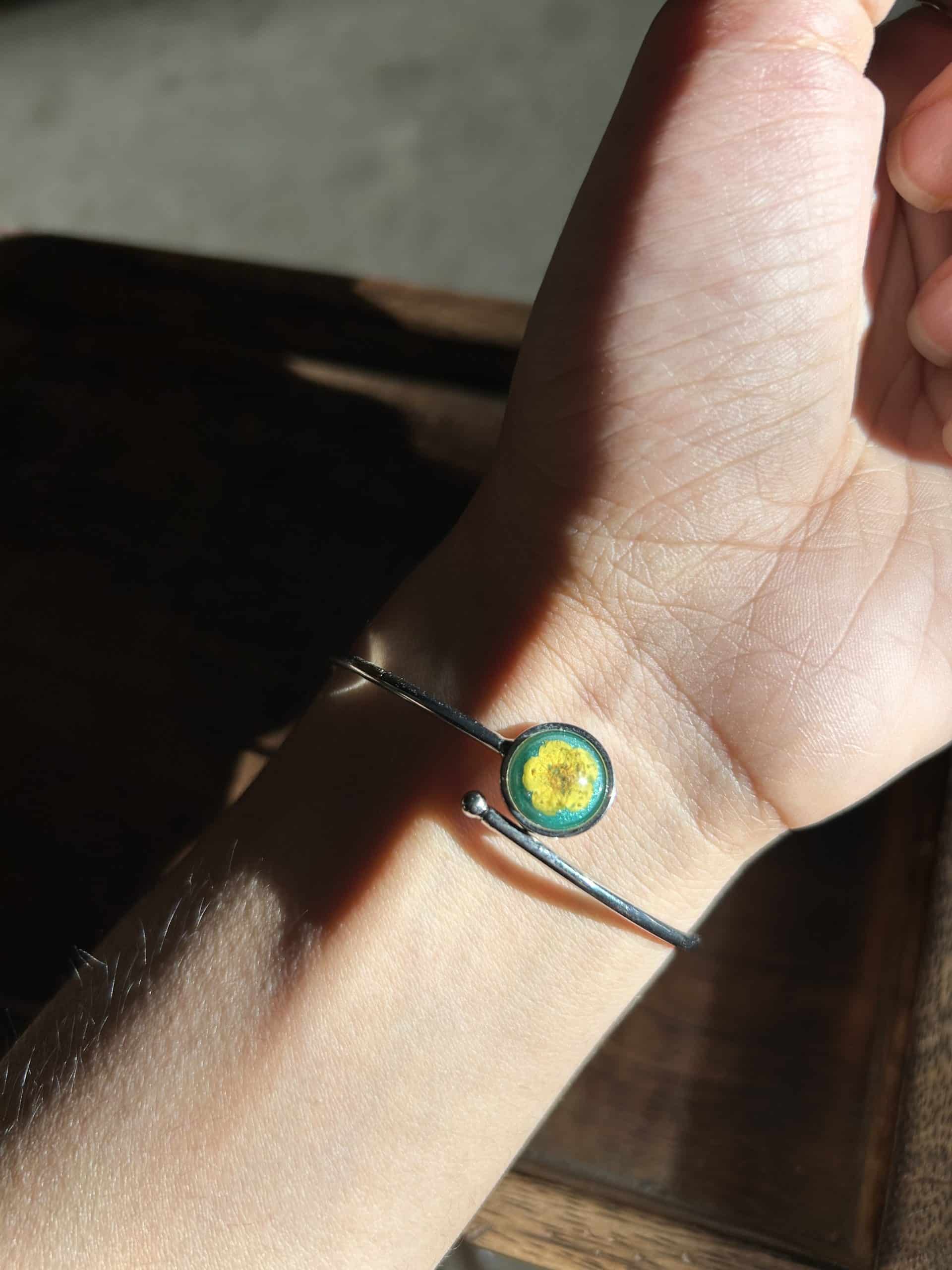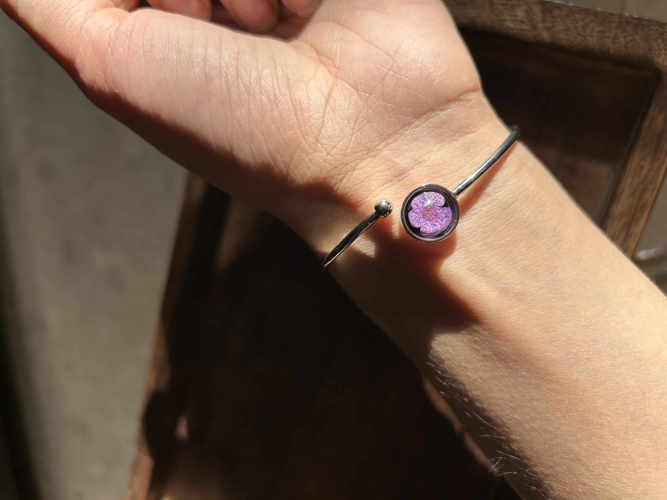 Design: Sleek adjustable bangle featuring a 1 cm preserved plum blossom charm