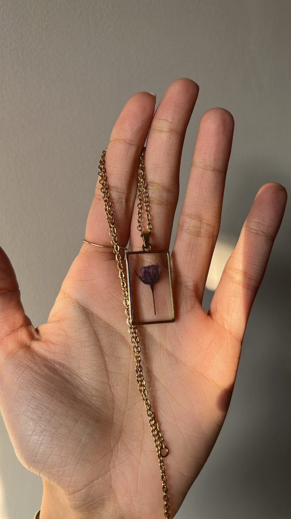 Design: A delicate pendant featuring soft purple-toned rose petals preserved in a glossy setting