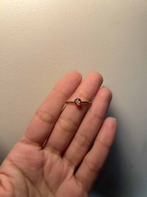 This ring has a translucent scarlet red base and a tiny white flower on the top. The flower used is the Queen Ann’s lace flower.