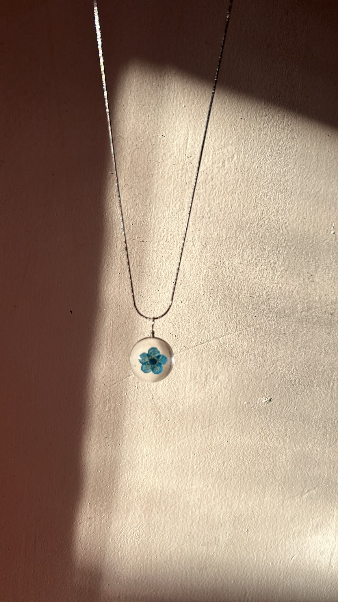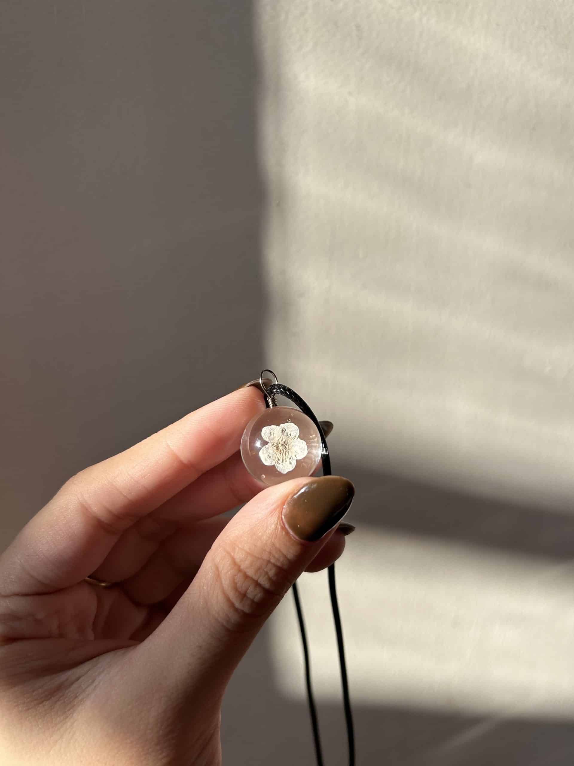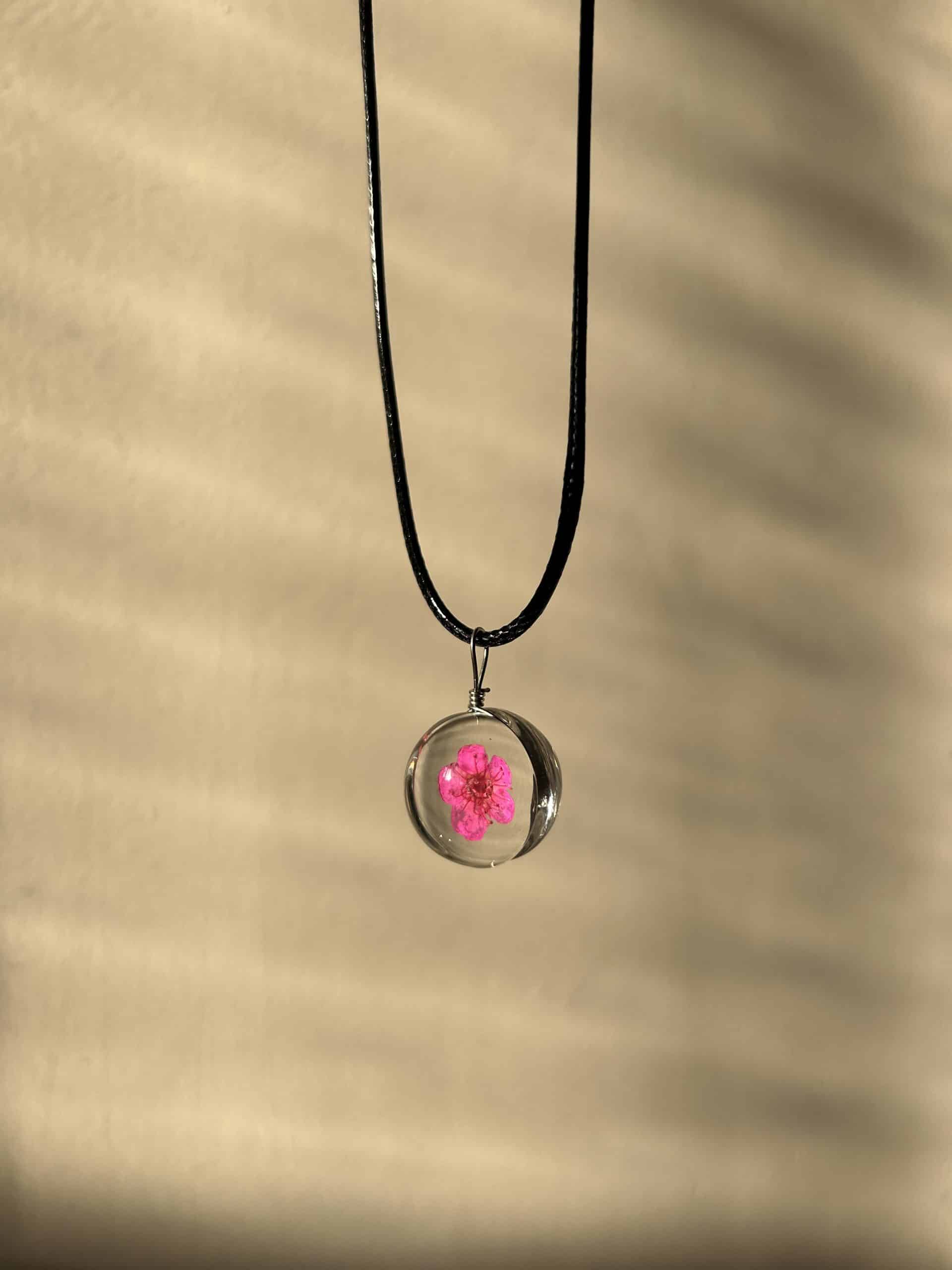 Design: Delicate spherical pendant encasing a tiny preserved bloom