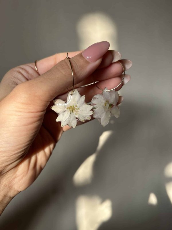 Made with authentic dried and preserved white larkspur, these one-of-a-kind earrings symbolize love, positivity, and an open heart, making them a perfect statement piece.