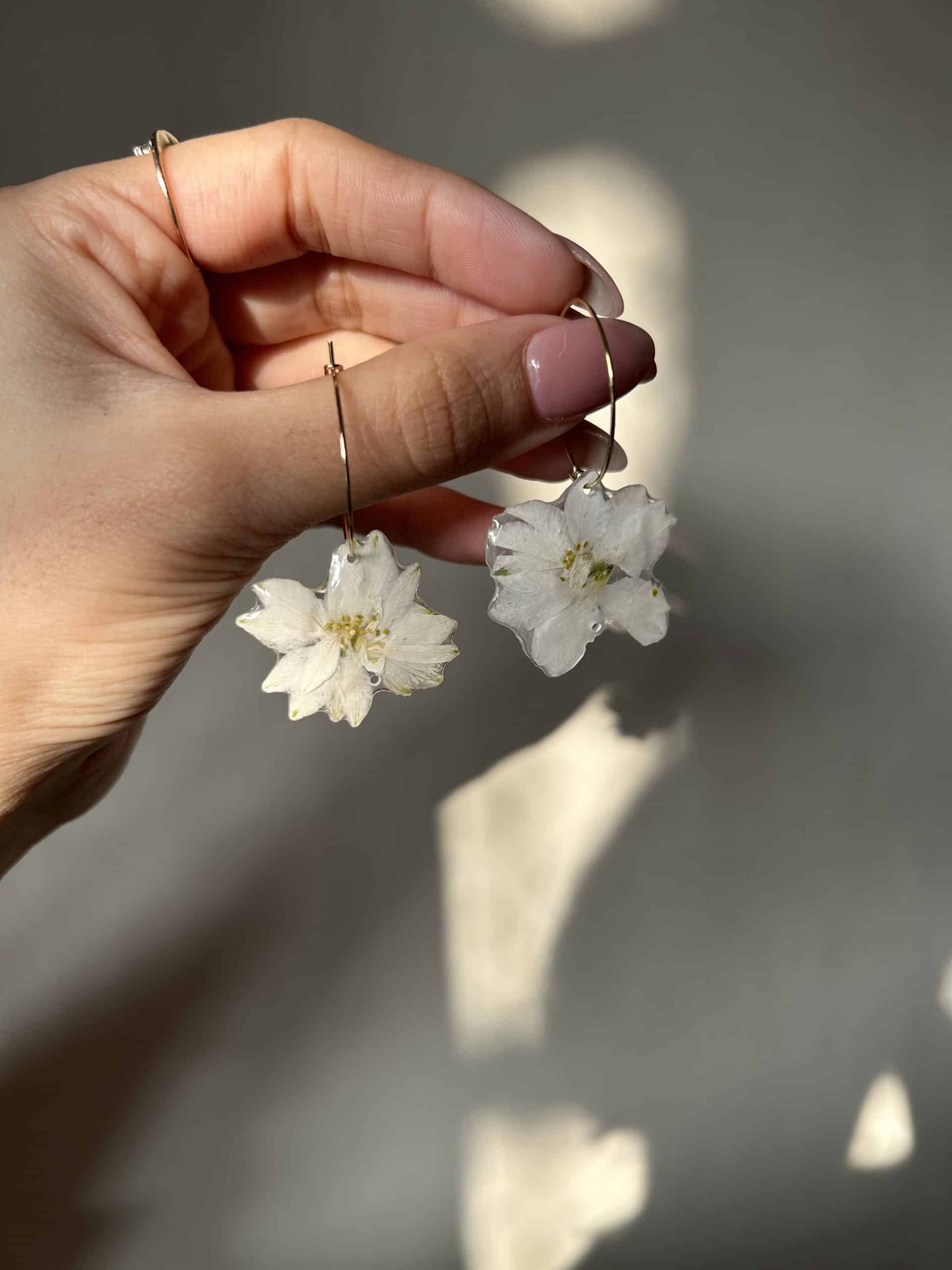 Made with authentic dried and preserved white larkspur, these one-of-a-kind earrings symbolize love, positivity, and an open heart, making them a perfect statement piece.