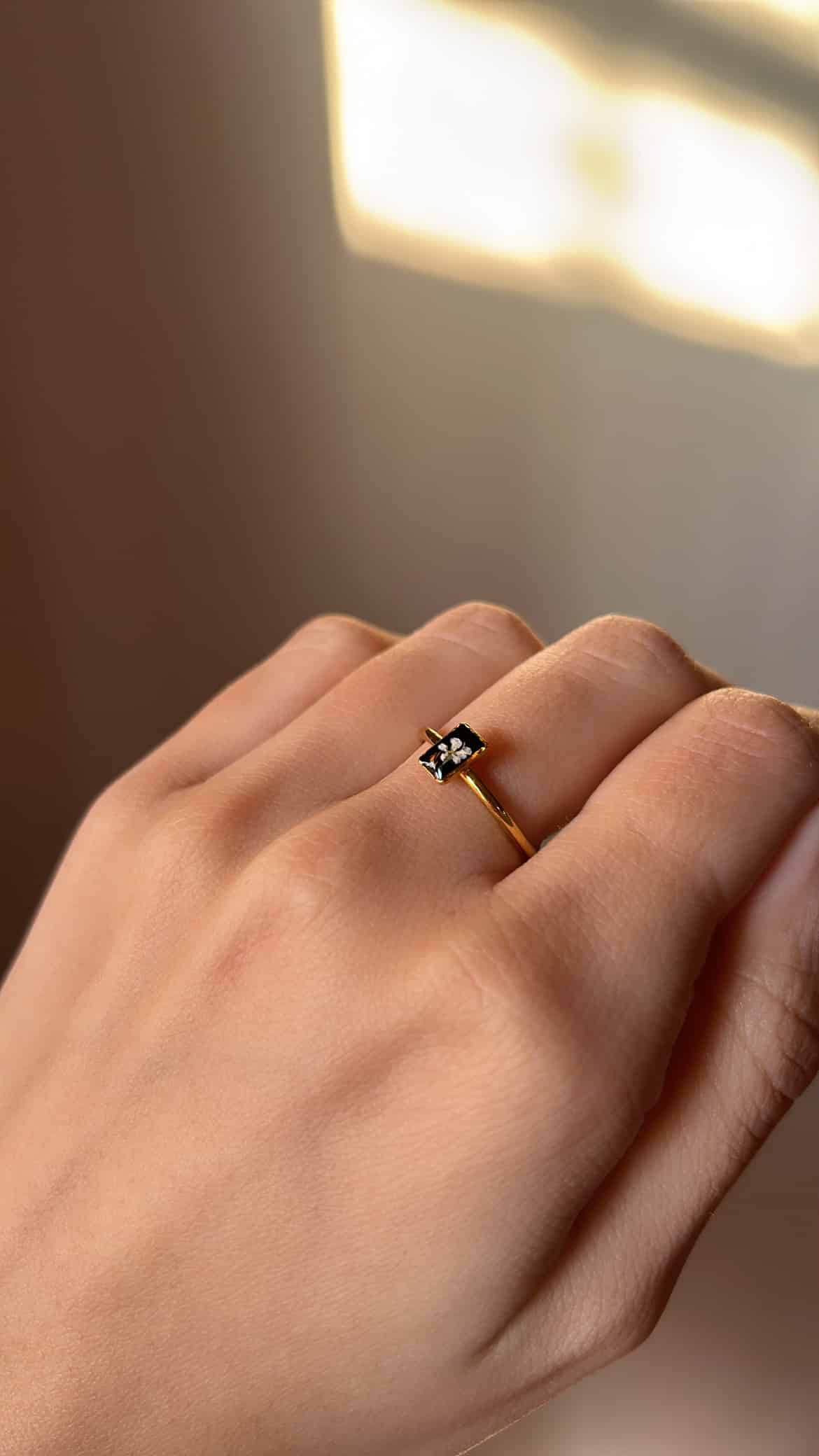 Design: Slim rectangle-shaped charm with a delicate preserved bloom
